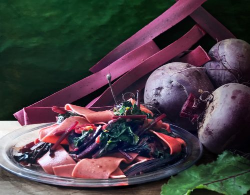 Pastadeeg wordt gemaakt in de keukenmachine of de kneedmachine. Het belangrijkste daarbij is het gebruik van grano duro, probeer niet te experimenteren met andere meelsoorten, dat heb ik al voor je gedaan. Als je de keukenmachine met het mes gebruikt het apparaat niet te vol stoppen (max. 400 gram droog meel) anders gaat de machine stuk. (De kneedmachine kan wel grotere hoeveelheden in een keer aan). Bij het maken van gekleurde pasta met een grof ingrediënt, dus geen poeder of inkt, moet je eerst de bieten, peterselie of wat dan ook fijn maken in de keukenmachine met het mes en een gedeelte van de grano duro. Pas als het ingrediënt niet meer zichtbaar is en alleen nog de kleur, kun je verder gaan met het deeg. Je kunt het afmaken in de keukenmachine (neem nooit meer dan 400 gram anders gaat de machine stuk, mogelijk zelfs minder tegelijk erin doen, je kunt ook het gekleurde meel overdoen in de kneedmachine. De aangegeven hoeveelheid eieren toevoegen en steeds druppelsgewijs water totdat een zeer droogkorrelig deeg is ontstaan. Het deeg voor verwerking enige uren laten rusten.